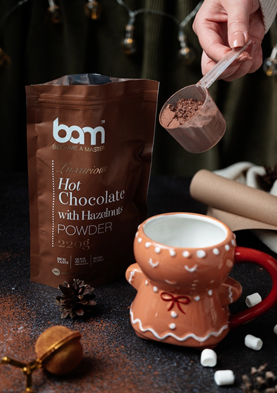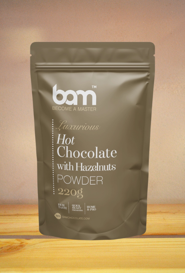 Ogrejte svoje trenutke z nepozabno skodelico BAM vroče čokolade z lešniki, ki združuje toplino, aromo in pravo čokoladno razvajanje.
