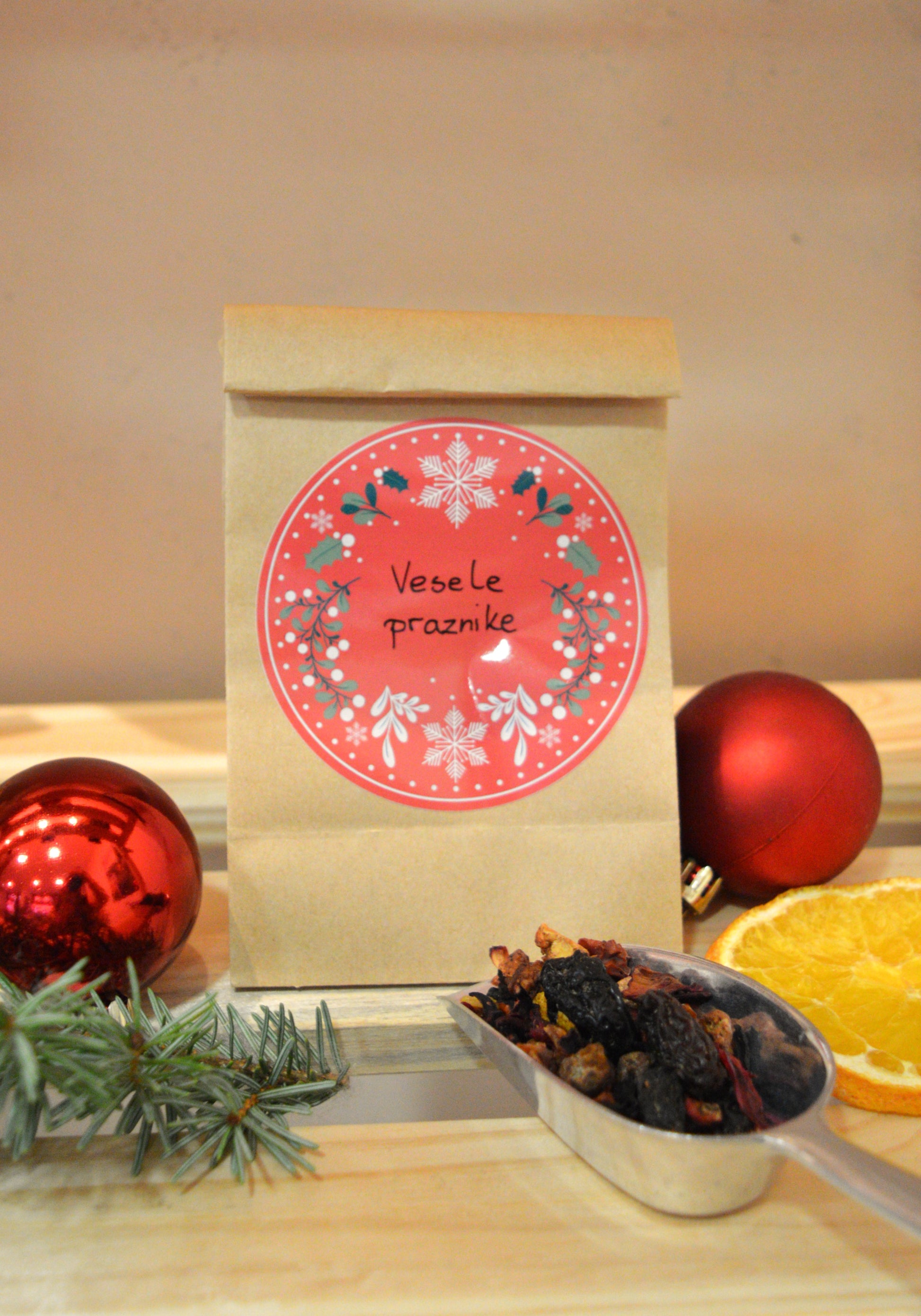 Vse skupaj je zapakirano v papirnato vrečko s praznično nalepko "Vesele praznike", zaradi česar je izdelek popolno darilo ali majhna pozornost, ki ogreje že na pogled.